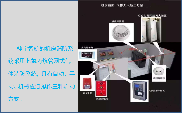 神宇智航的机房消防系统采用七氟丙烷管网式气体消防系统,具有自动、手动、机械应急操作三种启动方式。