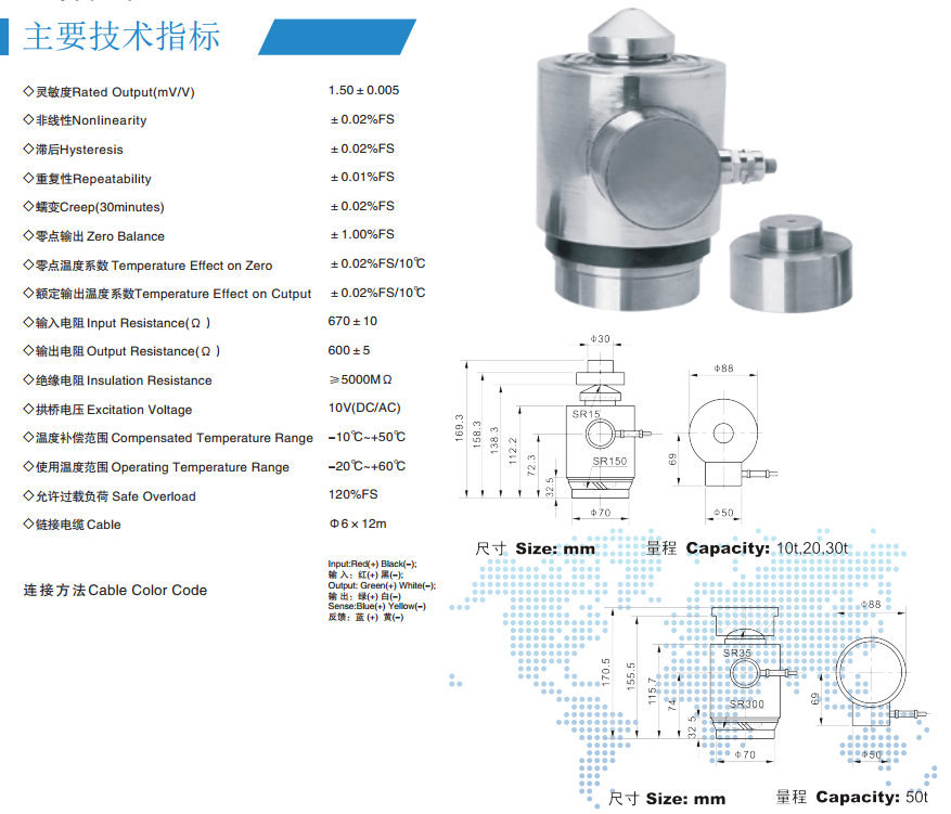 SYZ-05型柱式称重传感器为全封密双球头结构,采用氩弧焊接,防水防尘能力大,IP68等级要求。具有较好的自动调心功能,承载方式为压式,动态响应快,放过载能力强,安装容易,使用方便。可用于制造电子汽车衡、动态轨道衡、大吨位料斗秤等衡器。